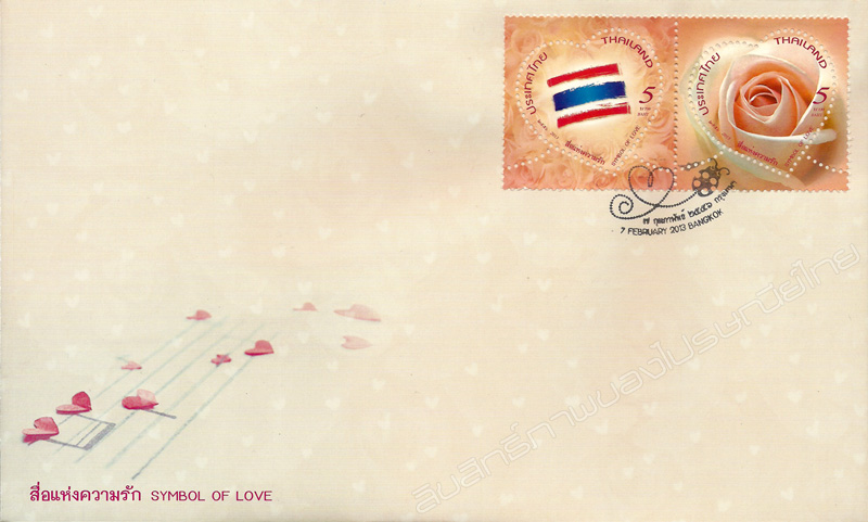 "Love" is a part of our lives and created by relationship between each other. Besides having good feeling toward one another, love can turn into powerful force that can unite people in the nation. Hence, this year, Thailand Post will lunch a stamp collection featuring old-rose roses and Thai flag in a heart-shaped frame which symbolize patriotism and unity. The heart shape in the stamp will be made by perforation technique.