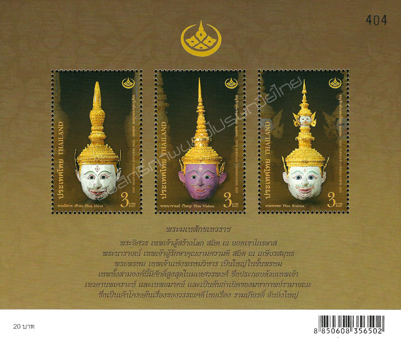 Khon or Thai masked play is the elegant and splendid Thai classical theatrical arts displaying the adventurous fighting drama dubbed by poem recitation together with Thai traditional orchestra in the background. The story is predominantly Ramayana praising honor of the Brahman God Rama. Most prayers must wear masks for the roles of demons (Yaksha) and monkeys, except for the male and female dancers. For this year's Thai Heritage Conservation Day, the first postage stamp series includes the Khon masks of devines (Deva) .